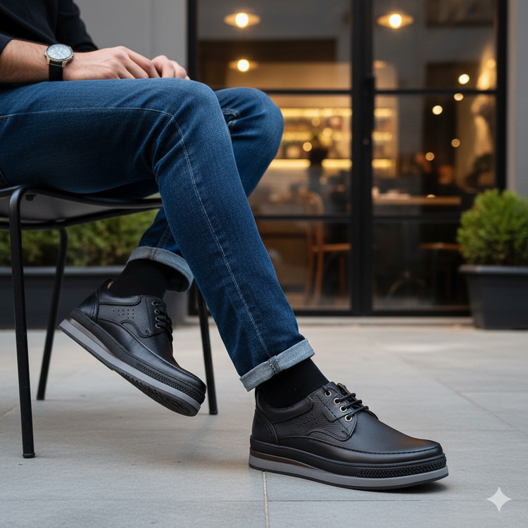 کفش چرم طبیعی و طبی روزمره که جنس رویه این کفش چرم طبیعی گاوی درجه 1 فلوتر و شرانگ و جنس آستر چرم طبیعی بزی ضد تعریق و جنس زیره ترمو آنتی شوک و ضد سایش عطر دار ایتالیا که به صورت دستدوز و دور دوز به به رویه متصل شده است و جنس کفی این کفش مموری فوم با رویه چرم طبیعی بزی آتی باکتریال و طبی با محافظ پاشنه می باشد . این کفش تمام چرم طبیعی بوده و از کیفیت و دوخت و دوام بسیار بالایی برخوردار است و همچنین صادراتی می باشد.