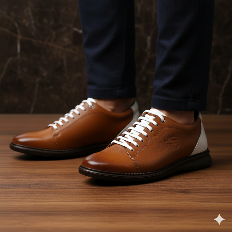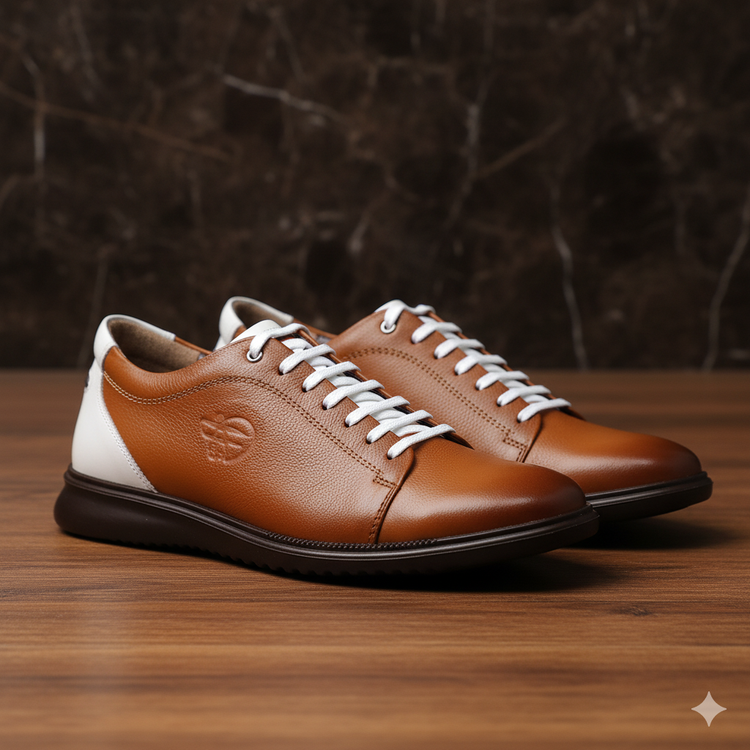 ظاهری شیک و بروز با استایل اسپرت و نیمه رسمی مناسب استفاده روزمره و پیاده روی قابل ست با انواع شلوار های جین و کتان و پارچه ای . ترکیب رنگ این کفش رنگ جذاب عسلی و سفید می باشد