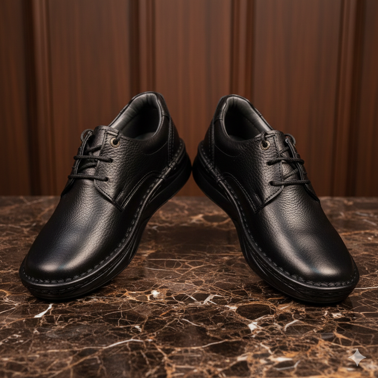 کفش چرم طبی مردانه کد TB011BK رنگ مشکی از چرم طبیعی گاوی باکیفیت ساخته شده و دارای زیره پیو ترک سبک و طبی است. این کفش چرمی اصل تبریز با طراحی شیک و مدرن، انتخابی عالی برای استفاده روزمره با استایل های اسپرت و نیمه رسمی محسوب میشود.