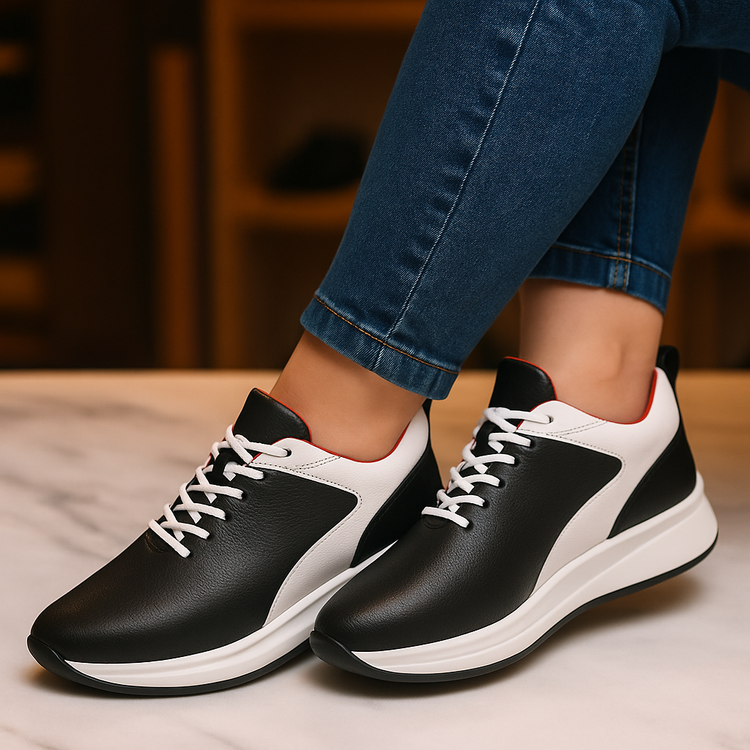 کفش تمام چرم زنانه 00152 کفشی است اسپرت و نیمه رسمی با استایل لاکچری اسپرت که جنس رویه این کفش تمام چرم گاوی ترکمان درجه 1 که به صورت 2تکه و 2رنگ جذاب مشکی و سفید استفاده شده. جنس آستر تمام چرم طبیعی میشن ضد تعریق بزی رنگ قرمز می باشد . کفی این کفش طبی تمام چرم میشن بزی آنتی باکتریال می باشد . و زیره این کفش ترمو خارجی آنتی شوک و ضد سایش خارجی ترک اسانس دار می باشد. قالب این کفش ترک بوده و بسیار راحت می باشد و یک سایز از استاندارد بزرگ می باشد. رنگ این کفش مشکی سفید می باشد .برای انتخاب یک سایز کوچکتر از سایز استاندارد خود انتخاب کنید.