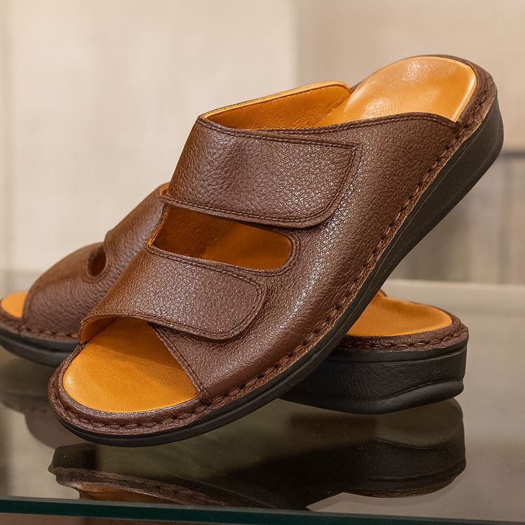 صندل چرم طبی تمام چرم طبیعی آی پی صندلی مردانه با سبک راحتی و اسپورت که جنس رویه آن تمام چرم طبیعی گاوی فلوتر درجه 1 قابل تنظیم و جنس زیره آن pu نرم و طبی فنری و کفی آن از جنس eva مموری فوم طبی با روکش چر بزی ضد تعریق که این صندل تمام دستدوز بوده و کاملا طبی می باشد و برای پا درد و زانو درد و کمردرد و انواع بیماری های پاشنه مناسب است . این صندل تمام چرم طبیعی بوده و از کیفیت بسیار بالایی برخوردار است و صادراتی می باشد .قالب استاندارد است سایز خودتان را انتخاب فرمایید